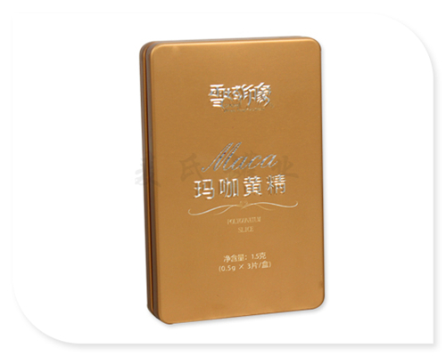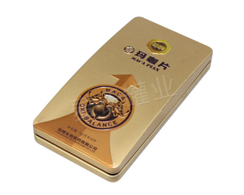 這款翻蓋瑪咖人參壓片糖果鐵盒,是醫藥保健包裝中常見的一款壓片糖金屬包裝產品,鐵盒材質選用國產一級0.23mm馬口鐵制成,根據客戶印刷需求,采用單面四色+一專色印刷工藝,外過光油,內過金油,強烈的光澤感官效果,時刻刺激消費者目光,促進產品銷售。